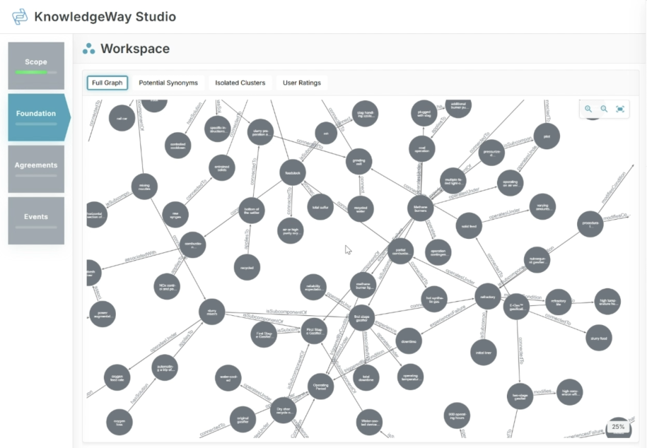 KnowledgeWay provides a familiar chatbot interface backed by the enterprise knowledge graph. Answers are more consistent, context-aware, and faithful to organizational reality. The platform works with any public or private LLM, including models deployed behind your firewall.